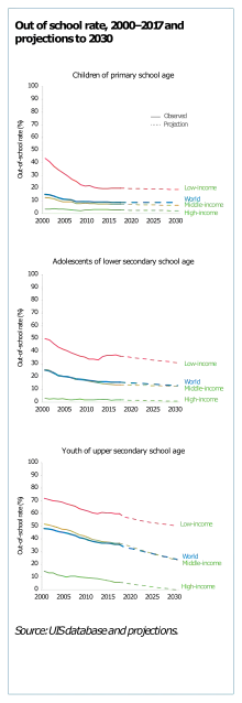 Financial difficulties that young people and their families face are major barriers when considering attending school.[1] Although primary education is free in several countries, students are also expected to pay for their school supplies, including books and transport to school. This is related to ethnicity, the rural-urban gap and gender, and produce inequalities.[6] Studies show that, in South Africa, financial barriers is the main obstacle to continuing education for black young people.[7]