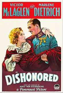 Dishonored is a 1931 pre-Code romantic spy film about a female spy for Austria-Hungary during World War I. It was co-written (with Daniel N. Rubin), directed, and edited by Josef von Sternberg for Paramount Pictures. The costume design was by Travis Banton. The film stars Marlene Dietrich, Victor McLaglen, Gustav von Seyffertitz, and Warner Oland.