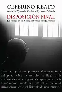 Disposición Final (Spanish: Final disposal) is a 2012 Argentine book by Ceferino Reato. It contains a long interview with Jorge Rafael Videla, de facto president of Argentina during the National Reorganization Process, and sentenced to life imprisonment for human rights violations. Videla detailed the reasons and procedures of the military government, and Reato provided the historical context.