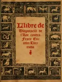 Disputa de l’ase (1417) is a Catalan medieval novel. It is about the discussion between a monk and a donkey about the human superiority over the other animals. After a long debate, and completely by surprise, it is the donkey who wins the argument, and so human superiority cannot be proven. The work was written by Anselm Turmeda, a Majorcan writer and former Catholic friar who lived in Tunis and converted to Islam. It is his longest work in Catalan, his mother tongue. It is of Arabic inspiration,[1] even though it incorporates an important portion of original elements, such as the literary style and a strong feeling of anti-clericalism.