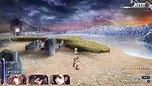 The biggest addition is within the single-player story mode of the game, taking place on a traditional-styled Final Fantasy world map, with players being able to experience a story while exploring a world with scenarios and events taking place as the story progresses. Players traverse the 3D world map with parties consisting of up to five characters, with players being able to interact in conversations with the characters. When roaming the map, players will encounter enemies known as "Manikins"; when attacked by an enemy, players will be transported to a battle map where battles will take place. There are specially marked shops on the map. The story mode is also party based, similar to the story progression of Final Fantasy VI. In certain scenarios, parties will be predetermined, but in most cases players are free to select their own party.[7] Alongside the game's new story mode, the game also includes the first game's story, which has been remade with the 3D world map as well as additional elements added for the new storyline. Tetsuya Nomura, producer and character designer for the game, has said that both storylines played together would result in approximately 60 hours of gameplay.[8]