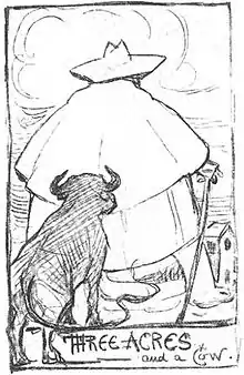 Similar views are presented by G. K. Chesterton in his 1910 book, What's Wrong with the World. Chesterton believes that whilst God has limitless capabilities, man has limited abilities in terms of creation. As such, man therefore is entitled to own property and to treat it as he sees fit, stating: "Property is merely the art of the democracy. It means that every man should have something that he can shape in his own image, as he is shaped in the image of heaven. But because he is not God, but only a graven image of God, his self-expression must deal with limits; properly with limits that are strict and even small."[42] Chesterton summed up his distributist views in the phrase "Three acres and a cow".