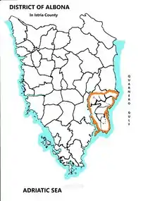 The District of Albona (Italian: Distretto di Albona) was one of many Districts which were named in Istria County, Croatia. A District is one of the lowest Administrative Division that, in some countries and at various historic times, was managed by the local government, and such was Albona. District in Italian "Distretto" is also called by other names; Quartiere (Neighborhood), Circondario (District), Provincia (Province), Circonscrizione (Circumscription, Circuit, Precinct, County), Regione (Region), Rione (District), Dipartimento (Department), it is a division of something greater.