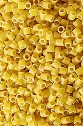 Ditalini [ditaˈliːni] (Italian: "small thimbles", also referred to as tubettini)[1] is a type of pasta that is shaped like small tubes.[2] It has been described as "thimble-sized"[2] and as "very short macaroni".[1] In some areas it is also called "salad macaroni." During the industrial age in Apulia, Italy, increased development of ditali and other short-cut pastas occurred.[3] In contemporary times, it is a mass-produced pasta. It is used in several dishes, and is commonly used throughout Sicily.