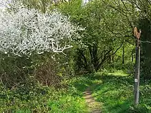 The Country Park is well known for its spring time display of bluebells, but unlike most bluebell displays that are usually protected by a leafy tree canopy, here the bluebell are sheltered by bracken. There is still petty whin, meadow thistle, bitter vetch, saw wort, dyer's greenweed, heath bedstraw, tormentil, betony and devil's bit scabious. There are also many orchids including heath spotted and common spotted orchid and a kaleidoscope of hybrids. It is one of the few truly native sites for wild columbine flowers and ling heather clings on. There are still rarities too including narrow buckler and adders tongue ferns, pignut, and the little heath milkwort.[3] In springtime there are emperor moths, in summer, there are green and purple hairstreak butterfly and in 2017 a well established colony of the rare and elusive black hairstreak butterfly was discovered that is thought to have existed undetected for some time.[8]
