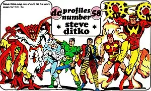 Ditko returned to DC Comics in 1975, creating a short-lived title, Shade, the Changing Man (1977–1978).[74][79] Shade was later revived, without Ditko's involvement, in DC's mature-audience imprint Vertigo. With writer Paul Levitz, he co-created the four-issue sword and sorcery series Stalker (1975–1976).[80][81] Ditko and writer Gerry Conway produced the first issue of a two-issue Man-Bat series.[82] He also revived the Creeper[83] and did such various other jobs as a short Demon backup series in 1979 and stories in DC's horror and science-fiction anthologies. Editor Jack C. Harris hired Ditko as guest artist on several issues of The Legion of Super-Heroes, a decision which garnered a mixed reaction from the title's readership.[84] Ditko also drew the Prince Gavyn version of Starman in Adventure Comics #467–478 (1980).[74][85] He then decamped to do work for a variety of publishers, briefly contributing to DC again in the mid-1980s, with four pinups of his characters for Who's Who: The Definitive Directory of the DC Universe and a pinup for Superman #400 (Oct. 1984)[86][87] and its companion portfolio.[88]