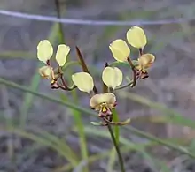 Diuris recurva, commonly called the mini donkey orchid[2] is a species of orchid that is endemic to the south-west of Western Australia. It has one or two leaves at its base, up to six small pale yellow and brownish flowers and grows in winter-wet places between Badgingarra and Kalbarri.