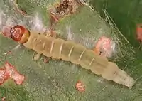 In the final instar larvae are about 25 mm long and can grow to 28 mm. The body is pale greyish green, the head is yellowish orange and the prothoracic plate is translucent green and sometimes there is a faint brown ochre lateral mark. The polyphagous larva feed between leaves which are spun flatly above each other on many deciduous trees and shrubs. They grow very slowly from late-May to September or early-October.[3][5]