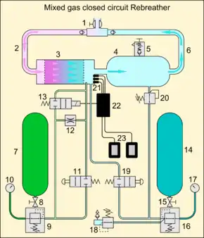 Closed circuit diving rebreathers may be manually or electronically controlled, and use both pure oxygen and a breathable mixed gas diluent.[7]