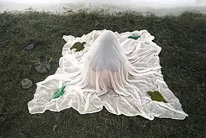 Diwan has pushed the boundaries of photography by developing a technique of combining painting, acting, and photography to narrate his personal impressions and experiences of the world in and around him. He creates a three-dimensional immersive environment in which there is a painting in the backdrop, actors whose bodies are painted and props[14] created specifically around the themes he is working on (in the series Violence, Waking the Dead, Shores of the Unknown and After the Turmoil).[18] This temporary installation of various elements is photographed on a transparency film which is further exposed in the darkroom on a normal photographic paper by controlling the rendition of images with the play of filters.[17]