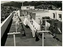The Dixon Street Flats in central Wellington were completed in 1944[1] (1947 in Kernohan[2]) as part of the first Labour Government's state housing program. They were designed by the chief architect of the Department of Housing Construction Gordon Wilson. The Austrian born architect Ernst Plischke was employed by the Department of Housing Construction at the time of the design and is popularly thought to have had considerable influence over the Dixon Street design, even though there is no documentary evidence to support this.[1] It was awarded the NZIA gold medal in 1947. It is considered to be the archetype of Modernist apartment blocks in New Zealand. The building was the first major high-rise building and first major apartment block to be completed in Wellington after the Second World War.[2] Ten stories high, it contained 115 one-bedroom flats plus a two-bedroom caretaker's flat.
