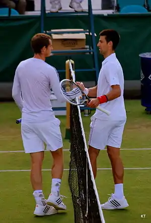 The Djokovic–Murray rivalry is a modern-day tennis rivalry between Novak Djokovic and Andy Murray. They have met 36 times (including 19 finals), and Djokovic leads 25–11 overall and 11–8 in finals.[1] Seven of these meetings have been in Major finals: the 2011 Australian Open, which Djokovic won in straight sets; the 2012 US Open, where Murray defeated Djokovic in an almost five-hour long match to claim his maiden major title; the 2013 Australian Open, with Djokovic prevailing in four sets; the 2013 Wimbledon Championships, where Murray won in straight sets; the 2015 Australian Open and 2016 Australian Open, with Djokovic again prevailing in four and three sets, respectively; and the 2016 French Open, where Djokovic completed the career Grand Slam with a four-set victory.