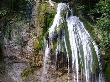 Djur-djur (Armenian: Ջուր-Ջուր — water-water; Crimean Tatar: Curcur — «onomatopoeia to the falling water»)[2] — waterfall is located on the Ulu-Uzen' river in the Crimean Mountains of Crimea. Waterfall height is 16 metres (52 ft). Djur-djur has not dried up ever, even in the dry years. Water from the waterfall falls into a small lake, and then comes into the river channel, which flows into the sea near the village Solnechnogorsk.[3]