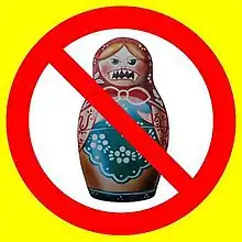 "Do not buy Russian goods!" (Ukrainian: Не купуй російське!, romanized: Ne kupuy rosiyske!) or "Boycott Russian goods!" (Ukrainian: Бойкотуй російське!, romanized: Boykotuy rosiyske!) is a nonviolent resistance campaign to boycott Russian commerce in Ukraine. The protest started on 14 August 2013 as a reaction to a Russian Federation trade embargo against Ukraine. It was organized by Vidsich on social media.[1] The campaign expanded to mass distribution of leaflets, posters, and stickers in over 45 cities and towns. Having faded by the beginning of the Euromaidan demonstrations in November 2013, it was renewed on 2 March 2014, during the Crimean crisis and the Russo-Ukrainian War.