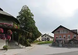 - The double hayrack at the Župan farm (Slovene: Županov toplar), with seven stone pillars per side with intermediate wooden pillars, stands by the Župan farm at Loka Street (Slovene: Loška cesta) no. 78. It has a symmetrical gabled roof covered with flat concrete tiles. The gables are covered by boards arranged vertically.[11]