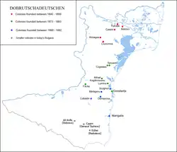 The first of these German settlers came between 1841 and 1856 from the Russian Empire.[2] They were farming families from the neighboring areas of Bessarabia and Cherson, who immigrated because of an economic recession in their home territories. Thirty years later colonists from Swabia also moved into the region. During this period, Dobruja still belonged to the Ottoman Empire and the colonists were subject to colonization regulations from Turkey. Consequently, the Dobrujan Germans were the only ethnic Germans to ever be Turkish subjects without actually moving to Turkey (as did the Bosporus Germans). They contributed to the agricultural development of the fertile steppes.