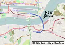 As part of an upgrade to allow three-car trains, strengthening work was necessary at the Delta Junction north of West India Quay.[44] It was decided to include this in a plan for further grade separation to eliminate the conflict between services to Stratford and from Bank. A new timetable was introduced, with improved frequencies at peak hours. The new grade-separated route from Bank to Canary Wharf is used throughout the day, bypassing West India Quay station until mid-evening.[45] Work on this project proceeded concurrently with the three-car upgrade work and the 'diveunder' (sometimes referred to as a flyunder but DLR have coined the term in this instance 'diveunder'), and the improved timetable came into use on 24 August 2009.[46]