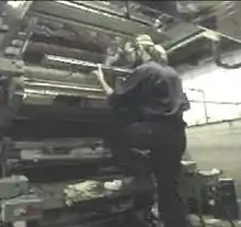 Important process variables in gravure coating & printing are the rotational position at which the blade wipes the cylinder, the angle that the blade makes with the tangent to the cylinder at the contact point, and the pressure applied to the blade.[6] Fine adjustment of in-and-out position, independently on left and right, must also be possible, in order to compensate for any misalignment between blade geometry and cylinder axis. These requirements are fulfilled by a doctor blade assembly which includes a doctor blade holder.