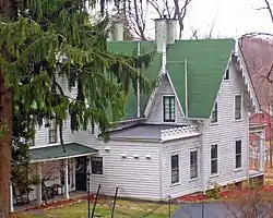 The Dodge-Greenleaf House is on NY 211 in Otisville, New York, United States. It was built circa 1855 in the Gothic Revival style. The architect is unknown but it exemplifies contemporary trends in home design popularized by the writings and pattern books of Andrew Jackson Downing of nearby Newburgh, as articulated in the Picturesque mode.