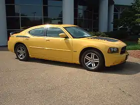 The Dodge Charger was reintroduced for 2006 with a limited production Dodge Charger Daytona package that included a sportier interior, classic high impact exterior colors, a rear spoiler, a front chin spoiler, a blacked out grille surround, rear quarter panel striping reading "DAYTONA" on either side, a blackout vinyl between the taillights on the decklid, and a black vinyl on the hood with the word "HEMI" cut out twice. Heritage R/T badges replaced the Stock R/T's chrome badges. A performance suspension with load-leveling rear shocks was also standard, as well as unique wheels. 2006 wheels were the stock R/T 18" wheels with charcoal grey painted pockets, and lower profile wider tires. 2007 to 2009 wheels are 20" chrome clad wheels. In 2008, the rear quarter panel stripes were removed, and replaced with a strobe stripe on the lower portions of the doors that reads "DAYTONA" towards the front of the stripe. The hood decal was also modified. The 2006–2008 Daytona gains 10 hp (7 kW) over the standard Charger R/T via a freer flowing exhaust system featuring a single pass center muffler, and a larger diameter stock air cleaner giving it 350 hp. The car also had unique engine management software that removed the stock R/T speed limiter. The 2009 features the new Variable Camshaft Timing HEMI, producing 368 hp (274 kW). These are the First Daytona's to wear a badge listing the number it was produced out of total production numbers