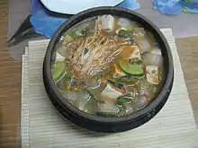 Doenjang[1] (된장; "thick sauce") or soybean paste[1] is a type of fermented bean paste[2] made entirely of soybean and brine. It is also a byproduct of soup soy sauce production. It is sometimes used as a relish.[2]