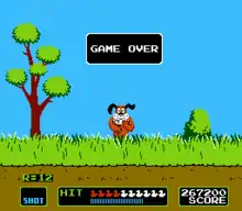 1UP.com listed him as the seventh best dog in video games, stating that even though he is annoying, he is ballsy enough to laugh at someone with a loaded rifle.[29] GameDaily listed the dog as the third greatest in-game moment,[30] and they stated that while dogs are man's best friend, that if the dog from Duck Hunt is man's best friend, they'd hate to meet their enemy.[30] They also included him in their list of characters they wish they could kill, stating that almost everyone they talked to, even dog lovers, wanted to shoot him.[30] In another GameDaily article, they state that the goal of the game was not just to shoot all of the ducks, but to avoid being laughed at by the dog.[30] Nintendo Power listed the dog as one of the things they love to hate, stating that there isn't a Duck Hunt player in the world who hasn't wanted to shoot him.[31] GameSpy listed the dog as the 10th favourite dog in video games, stating that while a dog in real life doesn't judge its master, the Duck Hunt dog unfortunately is not like that.[32] both IGN and Nintendo Power have referred to the dog as something players "love to hate".[33][34]