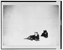 At Cape Denison the dogs initially fared well. Although the winds were fierce and blizzards frequent, the dogs seldom suffered unless the temperatures were well below zero; some of the stronger dogs were quite happy to sleep outside even when the conditions were severe enough to keep the men trapped in the huts.[19] When the conditions became too extreme the dogs were brought in to the "verandah",[20] a partially enclosed passage outside the door of the hut, or into the hangar.[21] In July conditions deteriorated to such an extent that even though the dogs had been taken into the verandah, they were still often found frozen to the ground – Mawson noted "They whine piteously for they can't move".[22]