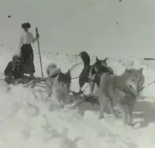 Douglas Mawson, the leader and organizer of the Australasian Antarctic Expedition, decided to take fifty Greenland dogs with him; he believed that number would be more than sufficient for the exploratory sledge journeys that he was planning to undertake during the year he planned to spend in Antarctica.[1] Mawson favoured dogs over ponies because, although they could only pull a little more than their own body weight, their food could be supplemented with meat from the fauna of Antarctica and – if necessary – from other dogs, so they did not need the vast imports of fodder that ponies required to see them through an expedition.[2] Mawson had been impressed by the enthusiasm of the dogs on the Nimrod Expedition when he had accompanied Ernest Shackleton to Antarctica.[2] Both Shackleton and Robert Falcon Scott were dubious of the advantage of dogs over ponies. Amundsen and the Arctic pioneer Fridtjof Nansen were passionate advocates and thought the British explorers had misunderstood how to employ dogs in the polar regions; Amundsen pointed to their successes in the Northern Hemisphere and the relative ease of handling dogs compared with ponies, especially in heavily crevassed areas where a fallen dog could often be easily retrieved but a fallen pony was usually lost.[3] The Norwegians were thoroughly utilitarian in their approach to dogs though; although they could be affectionate with the animals, there was little thought given to their survival when they had outlived their usefulness. Scott had used dogs on his Discovery Expedition and had felt it badly when he had been forced to kill them all during his southern sledging journey.[4] Nevertheless, his attitude towards dogs was similar to Amundsen's and Mawson's:
