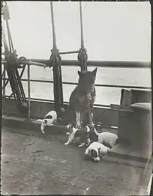 Mary, one of the dogs given by Amundsen, gave birth on 8 April 1913. One of her pups, Hoyle, survived to depart with the expedition,[45] but Mary herself fell ill and had to have an operation on 30 August.[44] It seems she did not improve and she died during a second operation on 29 October.[38] Hoyle was treated with benevolence by the other dogs while he was a pup. Once he was put in with the other dogs on 17 July, he quickly joined the group with Ginger's pups.