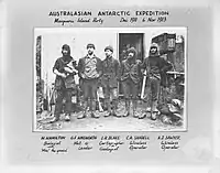 In Hobart, the dogs (accompanied by Ninnis and Mertz)[8][10] were put into quarantine until the expedition was ready to depart. Mawson had intended that they start their training during their stay in Hobart, but quarantine was strict and nothing seems to have come of this plan.[1] At the quarantine station – on a better diet, in less harsh conditions, and able to exercise – most put on weight and their condition improved,[12] but the seizures and deaths continued. Vets and inspectors were unable to agree on a diagnosis or prescribe for the illness, and five more dogs including Hooker, one of the early pups, died during the month they spent in quarantine.[8][n 2] On 2 December 1911, the remaining 36 dogs and two pups were loaded back aboard, and Aurora set sail first for Macquarie Island and then Antarctica. The ship arrived at Macquarie on 12 December and the dogs were let off under the care of Ninnis while the wireless relay station was established. The sealers working on the island helped secure the dogs and killed some elephant seals to feed them: