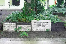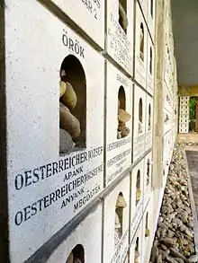 The Raoul Wallenberg Emlékpark (memory park) in the rear courtyard holds the Memorial of the Hungarian Jewish Martyrs — at least 400,000 Hungarian Jews were murdered by the Nazis.[17] Made by Imre Varga, it resembles a weeping willow whose leaves bear inscriptions with the names of victims. There is also a memorial to Wallenberg and other Righteous Among the Nations, among them: Swiss Vice-consul Carl Lutz; Giorgio Perlasca, an Italian man who, with a strategic escamotage, declared himself the Spanish consul, releasing documents of protection and current passports to Jews in Budapest without distinction (he saved five thousand); Mons. Angelo Rotta, an Italian Prelate Bishop and Apostolic Nuncio of the State of Vatican City in Budapest, which issued protective sheets, misrepresentations of baptism (to save them from forced labor) and Vatican passports to Jews, without distinction of any kind present in Budapest (saving fifteen thousand), who saved, with his secretary Mons. Gennaro Verolino tens of thousands of Hungarian Jews during World War II. Carlos de Liz-Texeira Branquinho a Portuguese diplomat, serving as Portugal’s Chargé d'Affaires in Budapest in 1944, issued protective Passports to hundreds of Jewish families, altogether about 1,000 lives were saved due to his actions.[18] Carlos Sampaio Garrido the Portuguese Ambassador who resisted the Hungarian political police when the police raided his home arresting his guests. The Ambassador physically resisted the police and was also arrested but managed to have his guests released by invoking the extraterritorial legal rights of diplomatic legations; five of the guests were members of the famous Gabor family.