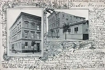 The building has been one of the first erected in Obrońców Bydgoszczy street under Prussian rule, initially to house a private high school for girls (German: Höhere Töchterschule), then registered at 9 Gammstraße.[34] In the 1910s, the school received the namesake of (Margarete) Dreger, one of its headmistress and was later called Dregersche Schule.[35] After the re-creation of the Polish state, the private high school kept working, for girls and boys, under the same appellation: Priwatne Liceum im. Drögera.[36] After the Second World War, the edifice lodged municipal Psychological and Pedagogical establishment No.1 (Polish: Poradnia Psychologiczno-Pedagogiczna). The institution moved out in the 2010s, and the ensemble has been proposed for selling to private owners by the city authorities in 2017.[37] The intent is to set up here various activities including a Social Services Center and a nursery.[38]