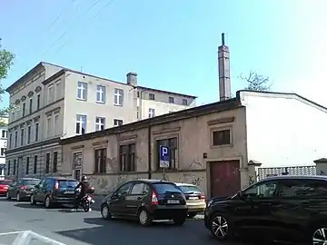 The first was house built in the 19th century: the architect Józef Święcicki and his family moved there a tenants from 1888 til 1890.[18] In 1905, on an abutting plot, a power plant for street car production was erected by General tram company in Berlin (German: der allgemeine und lokal und straßenbahngesellschaft in Berlin).[25] Still operative after WWI,[26] the company dropped down the tram manufacturing and maintained only the electrical power station in the late 1920s.[27] Until 1946, the tracks enabling the access of freight trams to the former power plant were still visible.[28] The only preserved elements are the hooks on the facades of some buildings in the street.