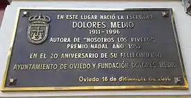 On 16 December 2016, 20 years after her death, the City of Oviedo paid homage to its writer by placing a plaque in the house where she was born, on Ramón y Cajal street, her life being described by Carmen Ruiz-Tilve, chronicler of the city who had written several works about Dolores Medio.[7]