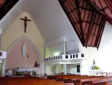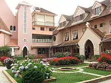 The church is located atop a hill in Da Lat. It is built in a style reminiscent of 17th Century French architecture.[1][4] The walls are made of pink limestome. The church features stained-glass windows and a large 3m of statue of the Virgin Mary standing upon a globe of the world.[1][4] The statue resembles a Vietnamese woman and was designed by French architect Jonchère in 1943. It was donated by Mrs. Decoux. Nicknamed the "Cherry Church" by locals, it is described as a fusion of French and Vietnamese architecture.[5] The French influence can be seen in the walls that allow a "creative manipulation of lights" with the various roofs of the complex designed in the style of the Nha Rong, a type of stilt house typical of the Central Highlands area of Vietnam. The church's façade is designed as an isosceles triangle and is noted for the number of small arch-shaped windows. A cross is located on top of the main triangular portion of the building. The church is part of a complex spanning 29.6 acres (12.0 ha), which also contains two convents.[5]