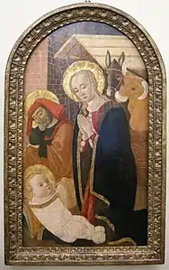 Domenico di Zanobi's paintings were first grouped together in 1966 by the American art historian Everett Fahy, who recognized about two dozen paintings in a similar style.[1][2] Since none of these paintings are signed, Fahy named their artist the "Master of the Johnson Nativity," after the panel of the Nativity in the Johnson Collection at the Philadelphia Museum of Art.[3] In 1996, the Florentine scholar Annamaria Bernacchioni identified this artist as Domenico di Zanobi, a documented assistant of Filippo Lippi in Florence and Prato, based on her discovery of the carpenter's bill for the Coronation of the Virgin at the Museo della Misericordia in San Miniato.[4] This painting, attributed by Fahy to the Master of the Johnson Nativity, was reportedly commissioned by the Chellini family in 1476 from a painter named "Domenico." Since the painting is clearly not by Domenico di Michelino, who also worked for the Chellini family, Bernacchioni suggest that it's by Domenico di Zanobi, who shared a workshop with Domenico di Michelino in Florence's Via delle Terme by 1467. The identification has since found acceptance among art historians.