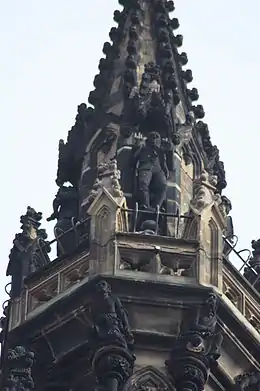Dominie Sampson is one of the 64 statues of figures from Scott novels found on the Scott Monument on Princes Street in Edinburgh. The figure is very hard to spot from ground level, as it is one of the four figures near the absolute apex of the monument, just above the final high viewing gallery.