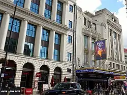 Construction of The Dominion began in March 1928 with a design by W and TR Milburn and a budget of £460,000. The site was the location of the former Horse Shoe Brewery, which was the site of the 1814 London Beer Flood. The first performance was 3 October 1929.[8] The Tottenham Court Road façade features a ground level entry sheltered by a broad marquee with the second through fourth levels framed by large pilasters. The central portion is concave and faced with Portland stone.[9] A three-bay bow window extends the height of the second and third storeys and is surmounted by sculpture of two griffins. Behind the griffin statue are three square openings which hold decorative iron grates. The griffins were removed in 1932 to mount an aeroplane for the musical Silver Wings. The remainder of the bow window was hidden during the run of We Will Rock You by a large shimmer curtain and statue of Freddie Mercury. These elements were reinstalled as part of the restoration. In addition to restoring the Tottenham Court Road façade, the stonework and windows of the dressing room block at the rear of the theatre were cleaned and replaced.