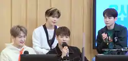 In March 2021, the group appeared in web show IU's Palette where host IU covered the group's previous hit "Sherlock (Clue + Note)", while Shinee covered IU's song "Dear Name". Shinee also taught IU the point choreography of "Don't Call Me".[48] Shinee guested and performed "Don't Call Me" on Japanese variety program Sôkai jôhô variety Sukkiri!! on March 2, which served as their first Japanese television appearance since their hiatus.[49] Shinee guested on the SBS Power FM show Cultwo Show on February 23, while Key and Taemin appeared on MBC FM4U Kim Shin-young's Noon Song of Hope on March 2, and Onew and Minho guested at KBS Cool FM show Kang Han-na's Volume Up on March 4.[50][51][52] Shinee guested on YouTube channel ODG where they watched video highlights of their career with young children.[53] The group appeared as panelists on the sixth episode of the eighth season of I Can See Your Voice on March 5.[54] Key appeared on the variety show I Live Alone, where he showcased his home and spoke to close friend Taeyeon about promoting Don't Call Me and mentioning Jonghyun during one of his speeches.[55]