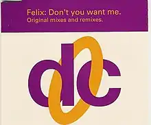 "Don't You Want Me" is a song recorded by British DJ and producer Francis Wright, known under the pseudonym of Felix, released as his debut single from his album, #1, in July 1992. Musically, it samples Jomanda's "Don't You Want My Love" and credited as Felix featuring Jomanda (remixed by Rollo and Red Jerry). Released on 27 July 1992, the song reached number six on the UK Singles Chart reached number one in Finland, Spain, and Switzerland. It also went to number one on the US Billboard Hot Dance Club Play chart and on the European Hot 100 Singles chart. In 1995 and 1996, the song charted in the UK again, but in remixed form. British magazine Mixmag ranked the song number 98 in its "100 Greatest Dance Singles Of All Time" list in 1996.[2]