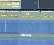 Hutson has been honored in a variety of ways. He was elected to the Wisconsin Athletic Hall of Fame as a charter member in 1951,[50] and the Alabama Sports Hall of Fame in 1968, also as an initial member.[51] His number 14 was the first number retired by the Packers, in a public ceremony at a game at City Stadium on December 2, 1951.[20] Hutson Street in the Packerland Industrial Park in Green Bay is named for him, and in 1994 the Packers named their new state-of-the-art indoor practice facility across the street from Lambeau Field the "Don Hutson Center."[52]