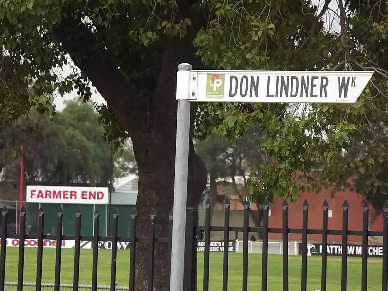 The Council of the City of Prospect commemorated Lindner's achievements by naming a short pedestrian walkway beside Prospect Oval after him. The walkway connects his former family home in Kintore Avenue with his football home in Menzies Crescent. On 29 August 2010, Mayor David O’Loughlin formally opened the Don Lindner Walk at an unveiling of a plaque at the Council Room within the North Adelaide Football Club, attended by over seventy guests and Lindner's family. The plaque has been placed on short bollards at each end of the walkway.[8]
