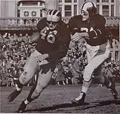 Born in 1928 in St. Louis, Mo., the son of Lyda and Russell Peterson. In his youth, his family moved to Racine, WI. He attended St. Catherine's High School and played football for the undefeated Angel's championship football team in 1945.[1] After graduating, Don enlisted in the U. S. Army and served in Japan, where he organized sports activities for U. S. troops after World War II. After returning, he accepted a scholarship to play football for the University of Michigan, and played football for the Michigan Wolverines football team from 1948 to 1951.[3][4][5][6] He played in the 1951 Rose Bowl game and finished the 1951 season as the fourth leading ground gamer in the Big Ten Conference.[7] During the 1951 season, he scored two touchdowns against Iowa and rushed for a career-high 104 yards against Illinois. In his final game for Michigan, Peterson rushed for 70 yards and scored the only touchdown in a 7-0 win over Ohio State.[8] At the end of the 1951 season, he was selected as the Most Valuable Player on the 1951 Michigan Wolverines football team and selected to play in the 1951 Blue/Grey All-Star Classic .[7] After graduating with honors with a major in zoology, he went on to graduate from the University of Michigan, School of Dentistry. His older brother, Tom Peterson, played fullback for Michigan in 1944-1949.[7][9] Don was selected by the Green Bay Packers in the 17th round (196th overall pick) of the 1952 NFL Draft.[10]