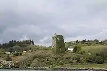 After the war O'Donovan fared particularly well and ended up in control of at least a few more territories than he began with, the result a combination of the government granting him lands (or rents) seized from septs of the MacCarthys and others, and his own aggressive efforts.[14][5] Carew, in a 1599 note to the government, describing in outline the lands of Carbery and associated, gives O'Donovan of Clancahill's as consisting of 67 ploughlands, two of those being set aside for the church.[30] These covered virtually the entire modern parishes of Drimoleague, Drinagh, and Myross (the Myross Peninsula between Glandore and Castlehaven harbours), and on these sat Donal's three castles of Castle Donovan (Sowagh), Rahine (Raheen), and Castle Ire (Ivor),[31] the latter two in Myross and the former in Drimoleague. A few centuries previous Myross had been the location of a Norman castle, Dún Mic Oghmainn, and it is probable that in 1326 an important battle won over Maurice fitz Thomas by MacCarthy Reagh and the Carberymen occurred at Mullaghmesha Mountain,[32] source of the River Ilen and which overlooks both the vale of Castle Donovan and the gap of Barnagowlane going northwest to Kerry.[33] Dún Mic Oghmainn had been demolished the century before by the MacCarthys following the Battle of Callann and the O'Donovans are believed to have been there with them at the battle.[11]
