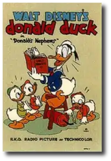 Donald's Nephews (1938) is a Donald Duck animated cartoon which features Donald being visited by his three nephews, Huey, Dewey, and Louie.[1] This cartoon is Huey, Dewey, and Louie's first appearance in animation.[2] The short, and the three nephews, was the idea of Al Taliaferro, the artist for the Silly Symphony comic strip, which featured Donald Duck. The Walt Disney Productions Story Dept. on February 5, 1937, sent Taliaferro a memo recognizing him as the source of the idea for the planned short. Taliaferro subsequently introduced the nephews in his comic strip, which by this time had been renamed Donald Duck, on Sunday, October 17, 1937, beating the theatrical release of Donald's Nephews by almost six months.[3]