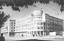 Hotel "Donbass" was built in 1938 upon the plans of N. Rechanikov and A. Shuvalova. During the construction, the project was redesigned by N. Porkhunov.[5] Panteley Tamurov supervised construction. During the Nazi occupation of Donetsk, the Gestapo was headquartered in the hotel; the building was partially destroyed during the war.[6] From 1947 to 1949, the building was renovated, but the dome was not restored due to lack of funds. In 1971, the Donbas National Academy of Civil Engineering and Architecture conducted restoration works.[7] The hotel was considered an architectural monument of the Donetsk region. On 26 February 2001, the old building was blown up. On 15 May 2004, the five star hotel "Donbass Palace" was opened. The new building slightly differs from the original. Currently, Donbass Palace is owned by ESTA Group, which operates the real estate business of System Capital Management group.