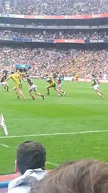 On 22 July 2012, Donegal retained the Ulster title for the first time in their history with a 2–18 to 0–13 victory over Down.[49] On 5 August 2012, they defeated Kerry. The first ever Championship meeting between the sides at senior level, it was only the second time in history that Kerry had been defeated at the quarter final stage.[50] Ahead of their next match against Cork, few outside the county gave Donegal a chance, and Cork went into the game as heavy favourites to win the title itself (even though this was only the semi-final). Donegal endeavoured to swat aside a lacklustre Cork side with ease and progressed to their first title decider since 1992.[51] Tyrone's Mickey Harte, attempting to analyse the game for the BBC, expressed his shock: "To be honest, I could not see that coming. Donegal annihilated Cork, there is no other word for it."[52] Martin McHugh, a member of the successful 1992 side, said it was the best ever performance by any Donegal team including his own.[53] Donegal emerged victorious from the 2012 All-Ireland Senior Football Championship Final on 23 September 2012 to take the Sam Maguire Cup for the second time, with early goals from Michael Murphy and Colm McFadden.[54] They defeated Mayo, on a scoreline of 2–11 to 0–13. Man of the Match was awarded to Michael Murphy, who scored 1–04.