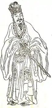 Dongfang Shuo (Chinese: 東方朔, c. 160 BCE – c. 93 BCE) was a Han Dynasty scholar-official, fangshi ("master of esoterica"), author, and court jester to Emperor Wu (r. 141 – 87 BCE). In Chinese mythology, Dongfang is considered a Daoist xian ("transcendent; immortal") and the spirit of Venus who incarnated as a series of ancient ministers including Laozi. Dongfang Shuo is depicted in the Wu Shuang Pu (無雙譜, Table of Peerless Heroes) by Jin Guliang.