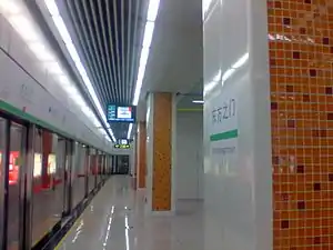Dongfangzhimen Station (Chinese: 东方之门站, literally Gate to the East Station) is a station of Line 1, Suzhou Rail Transit. The station is located in Suzhou Industrial Park of Suzhou, near the Gate to the East skyscraper, which is positioned at the intersection of the historical East-West-axis of Suzhou Old Town with the West bank of Jinji Lake. The station has been in use since April 28, 2012, the same time of the preoperation of Line 1.[1]