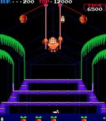 Donkey Kong hangs from vines at the center of the screen, and the player-controlled Stanley the exterminator runs and jumps on platforms beneath him. Stanley can fire bug spray at both Donkey Kong and insects flying around the levels. A level is completed by continually using bug spray on Donkey Kong, forcing him to the top of the screen, or by killing all of the bugs. A super spray can on the vines falls down when Donkey Kong is sprayed past it. The super spray only lasts for a limited amount of time, but it pushes Donkey Kong upward at a much faster rate, making it easier to complete the level. It only spawns at the start of each life.